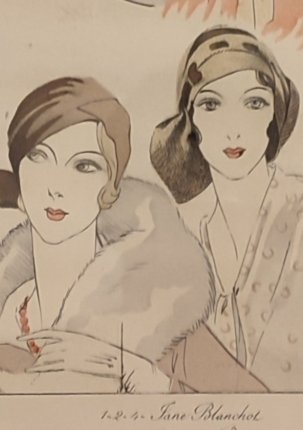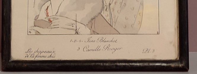 Affiche années 1920/1930 encadrée d’un catalogue de mode  » Les chapeaux de la femme chic » . représentant des femmes reconnues à l’époque pour leur élégance.
