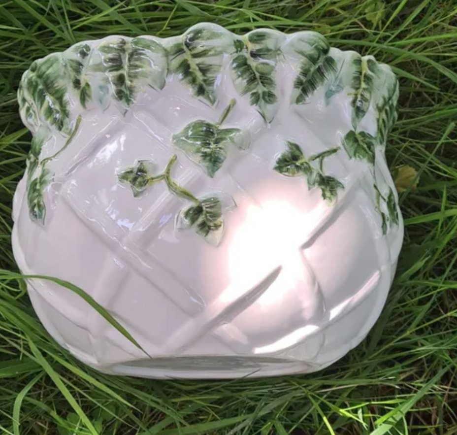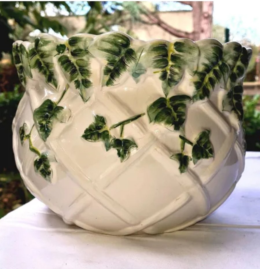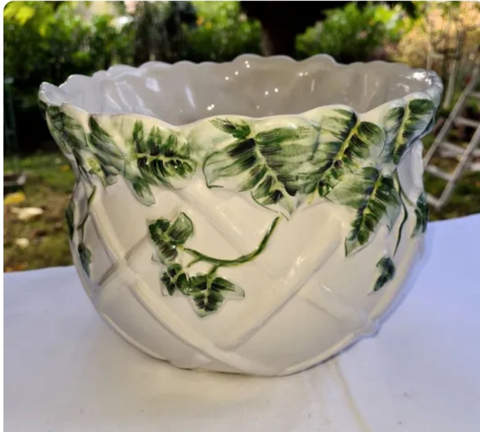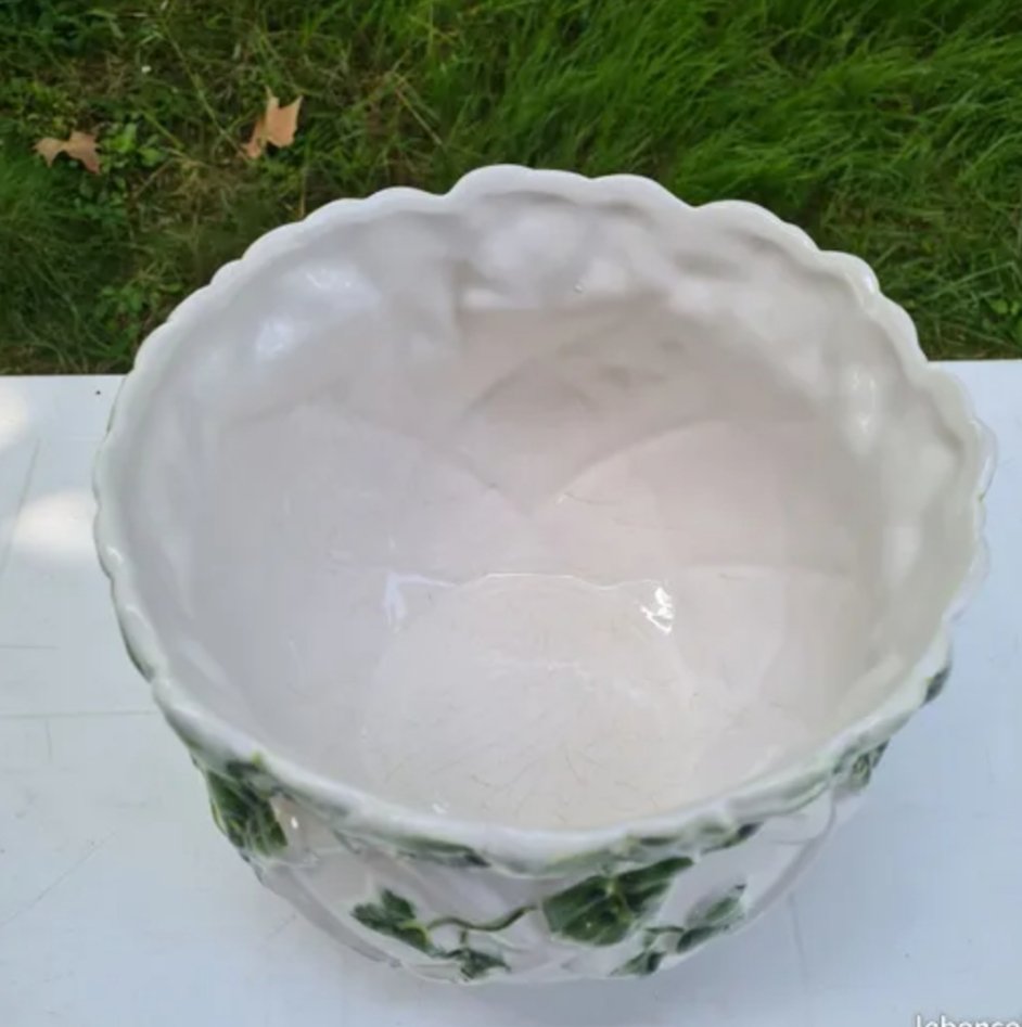 Cache pot en barbotine vert et blanc à motifs floraux.