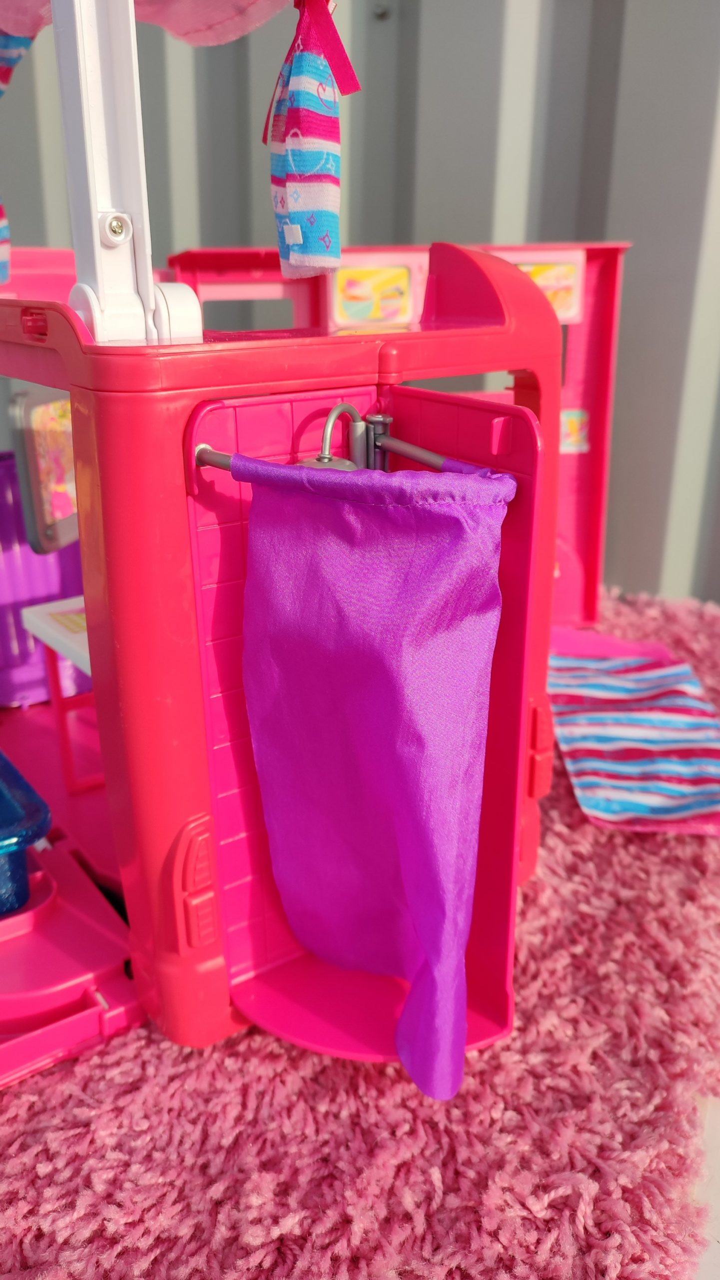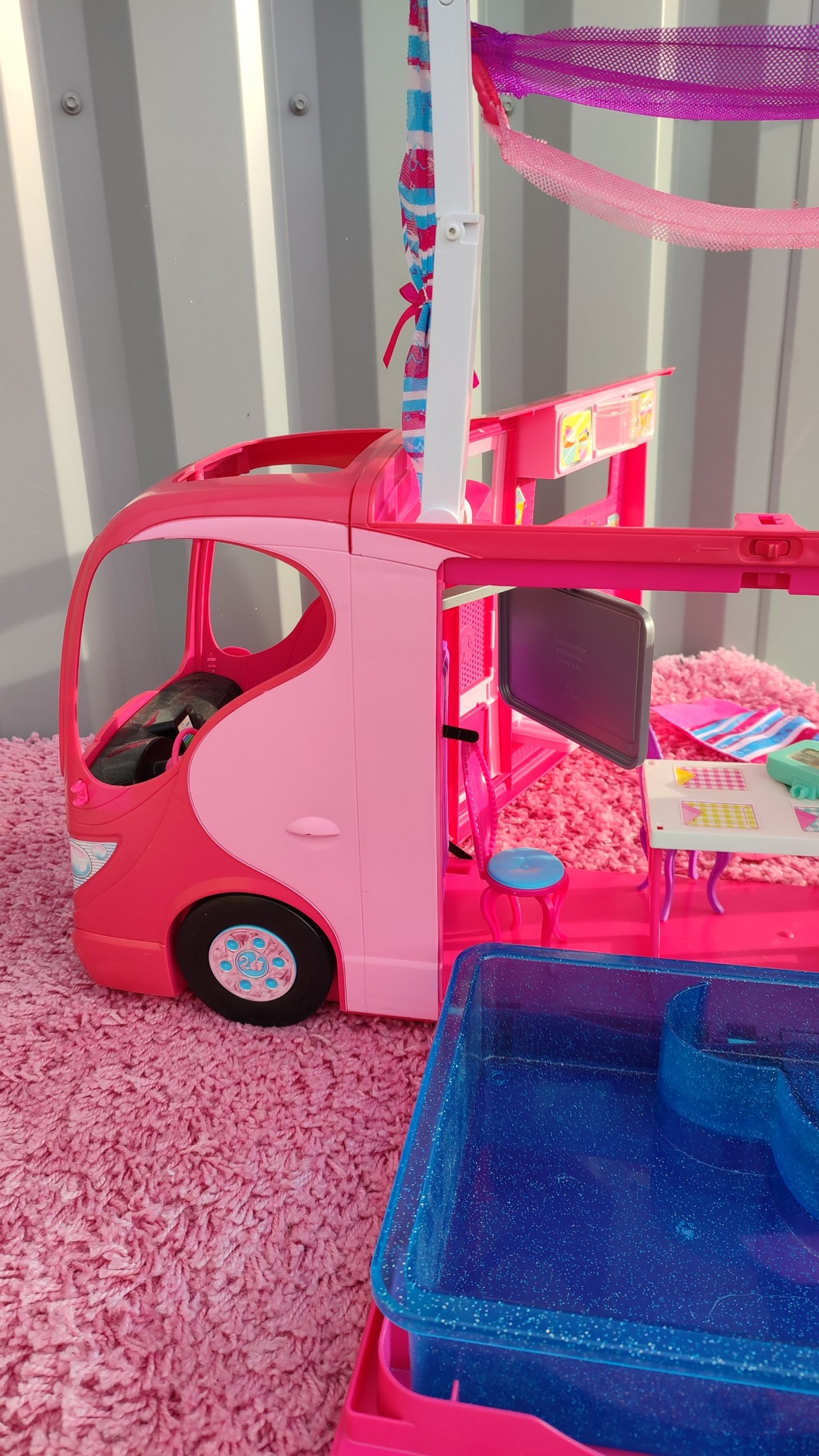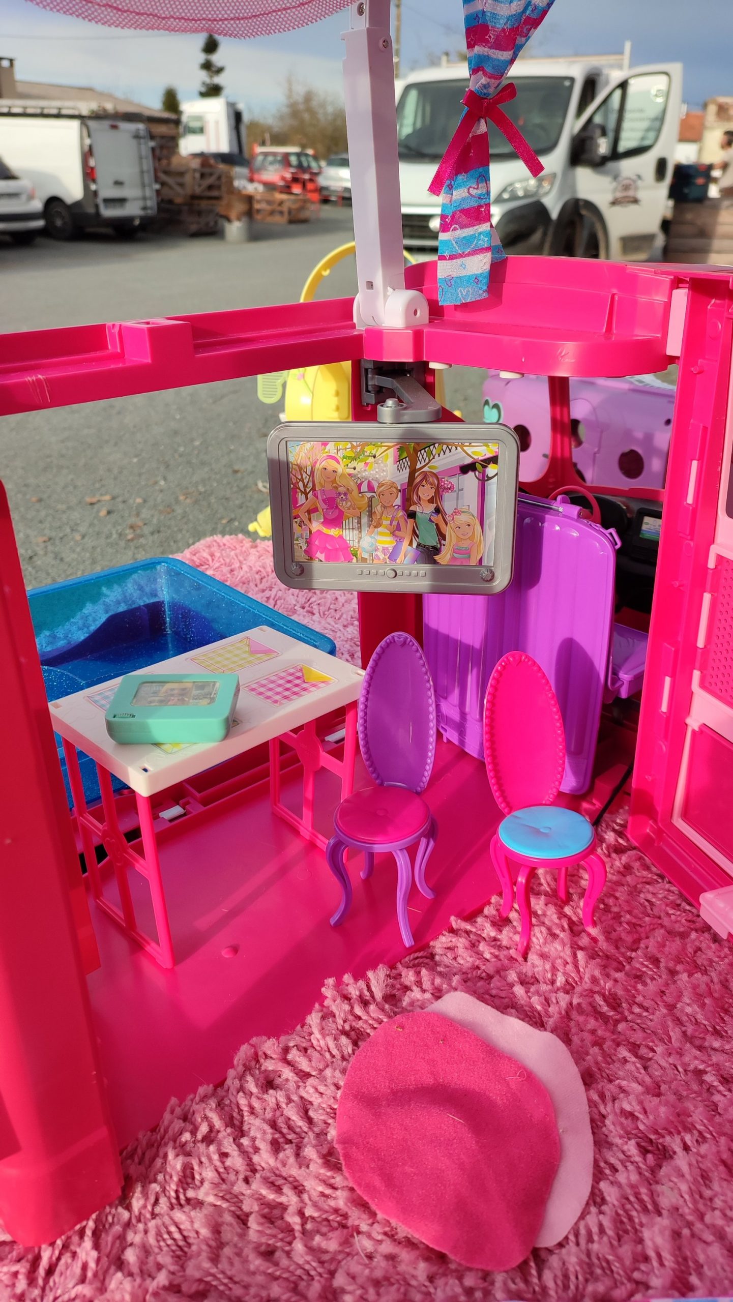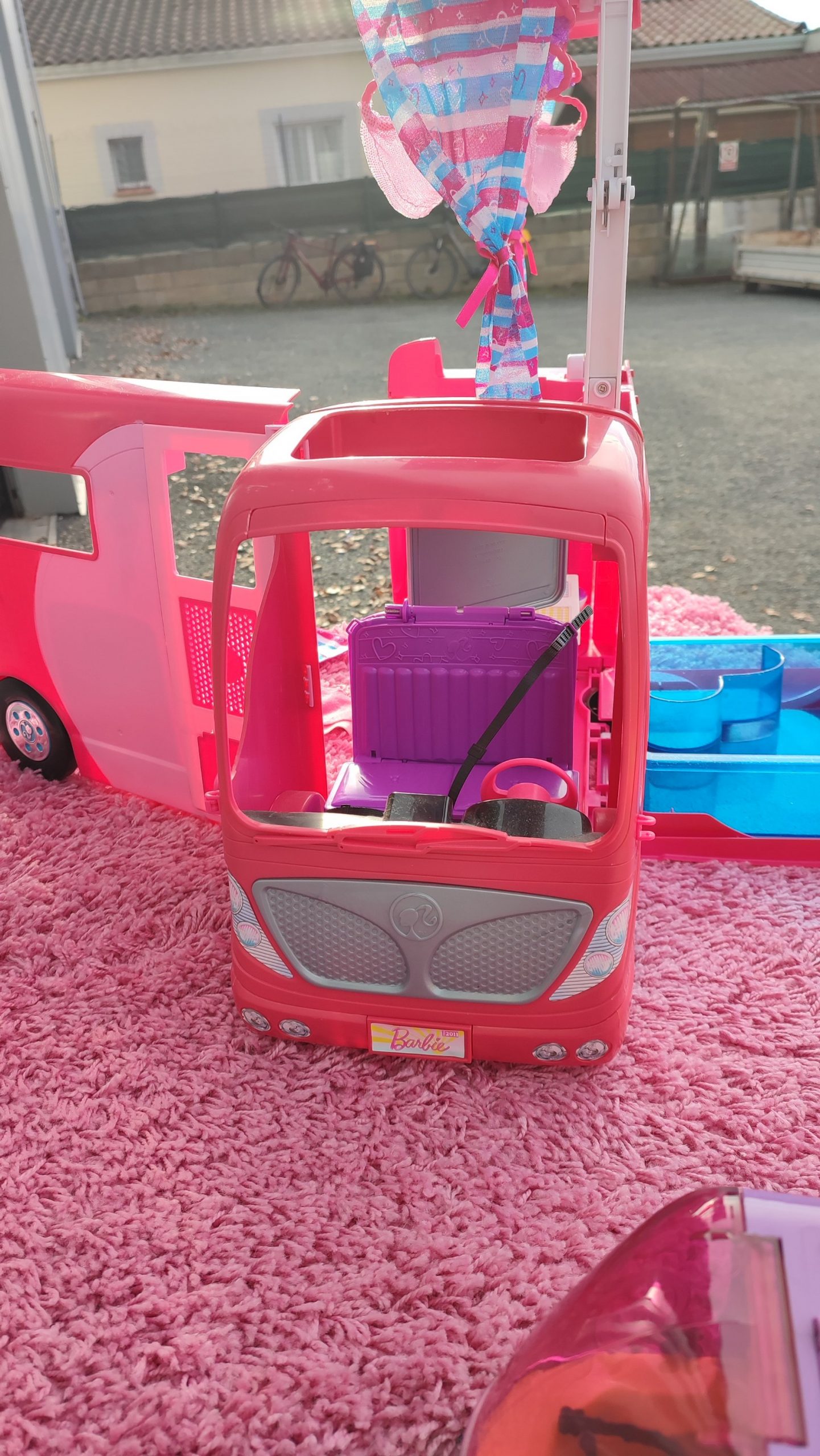 Camping car Barbie avec de nombreux accessoires.Cuisine, piscine, douche, hamacs…..