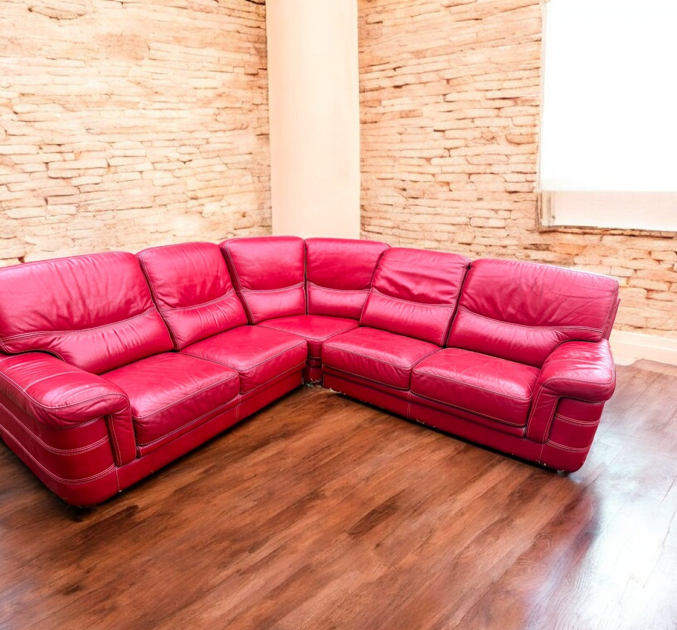 Grand canapé d’angle en cuir rouge/ bordeaux .
