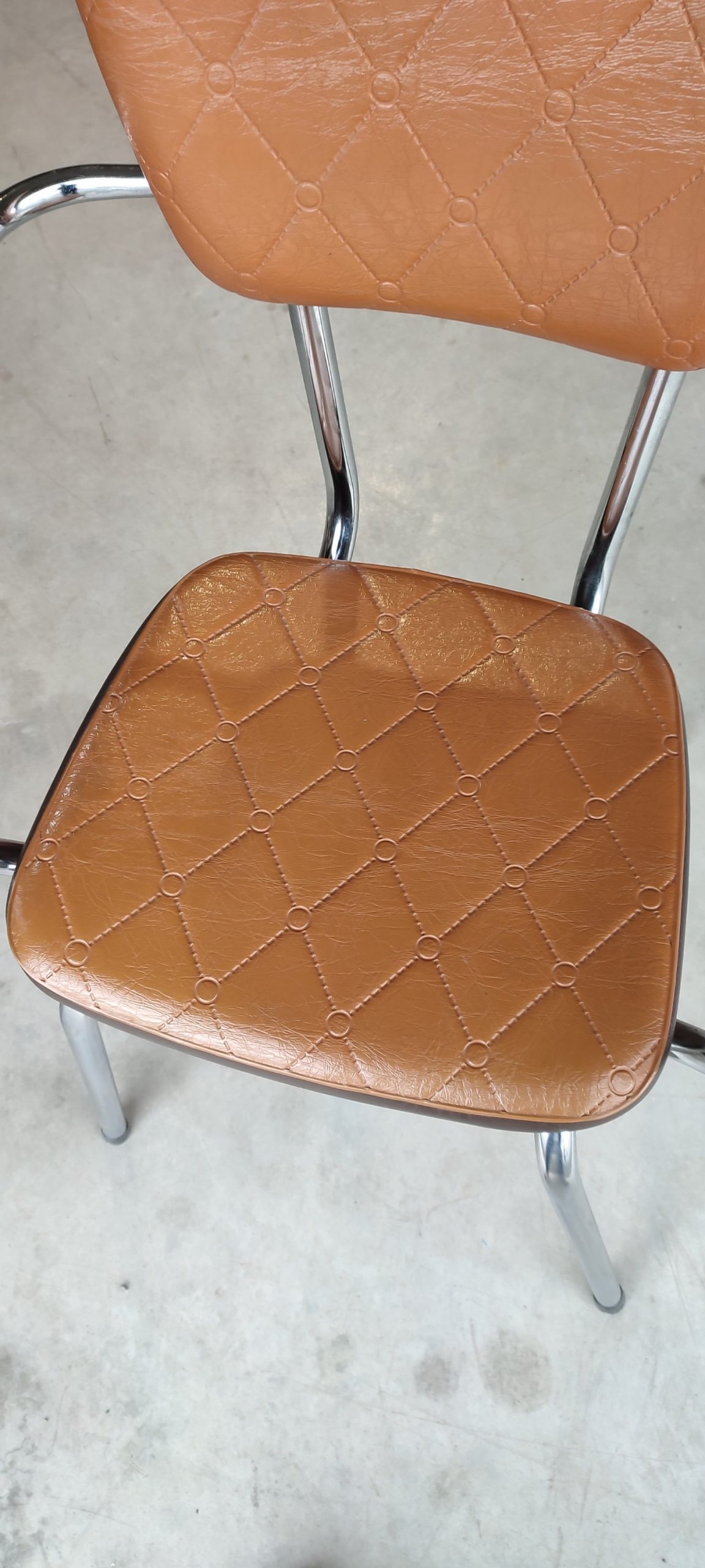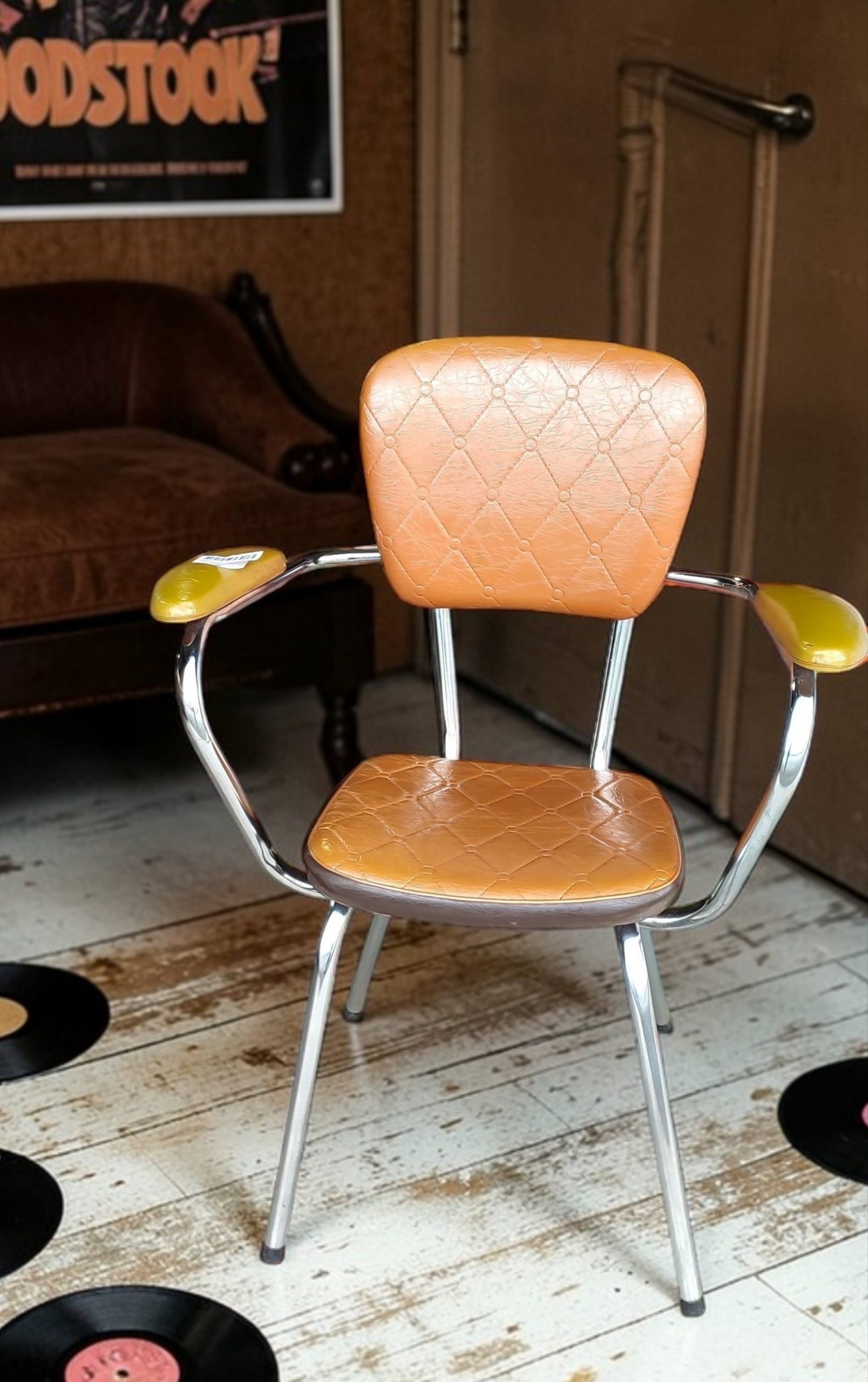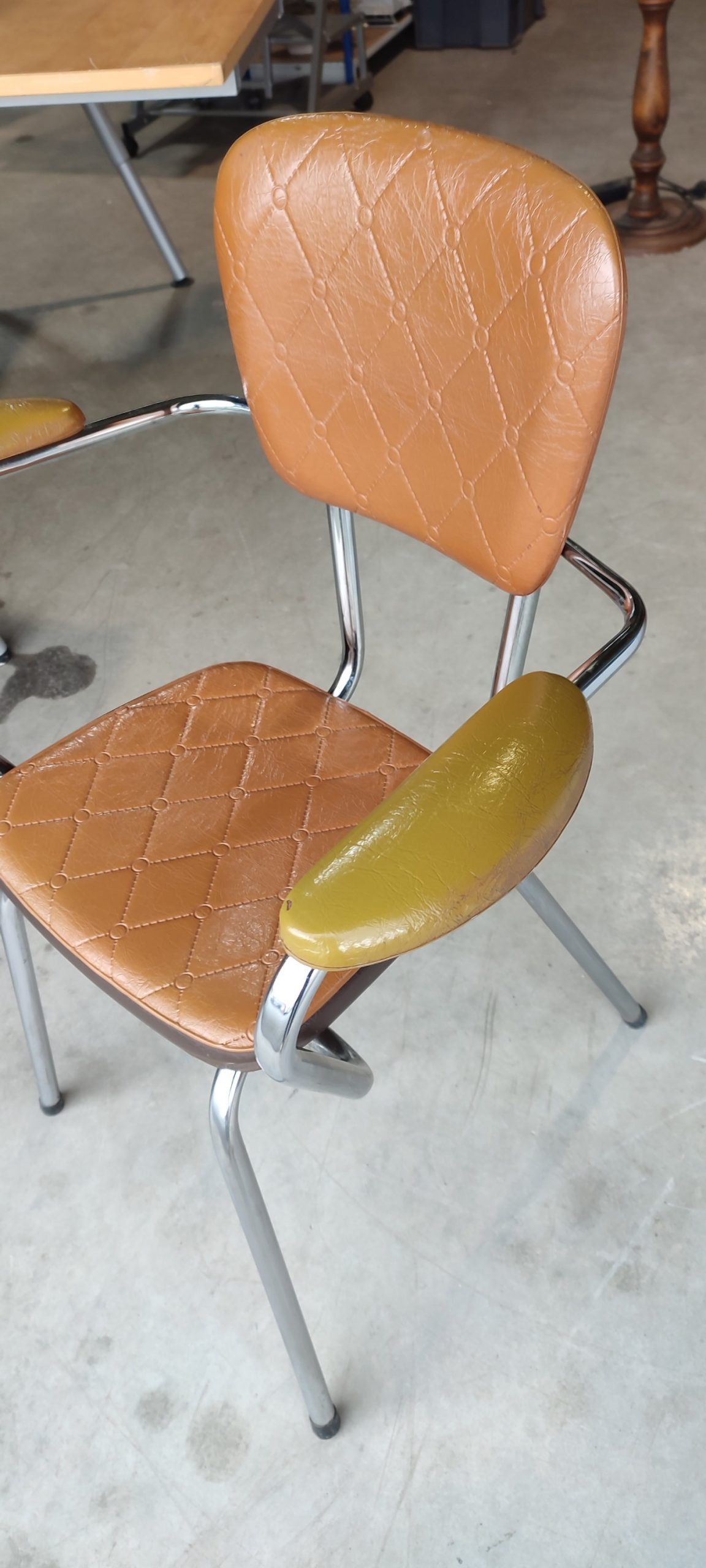 Emblème des années 70. : Chaise en skaï marron et accoudoirs moutarde.