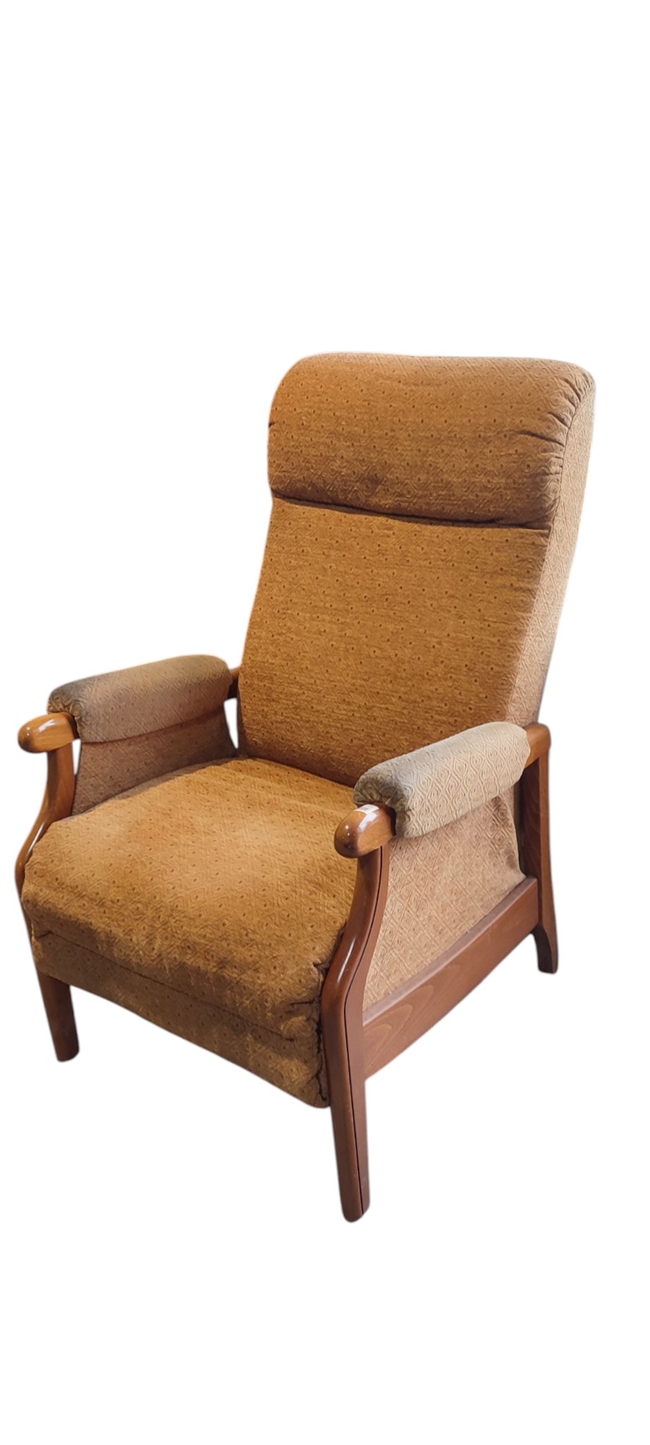 fauteuil accoudoirs et structure en bois. revêtement en tissu (à nettoyer).