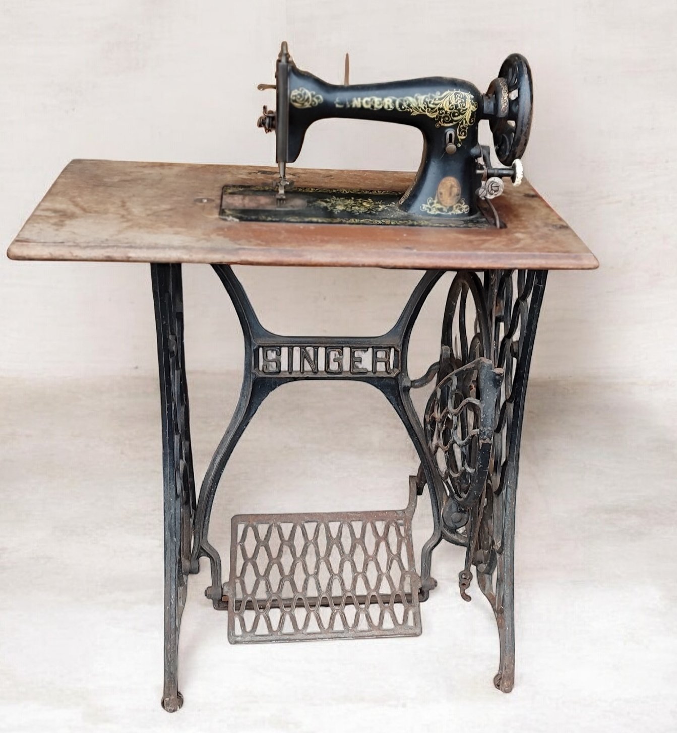 machine à coudre ancienne .Marque SINGER avec pédale, pied fonte et coffre bois)