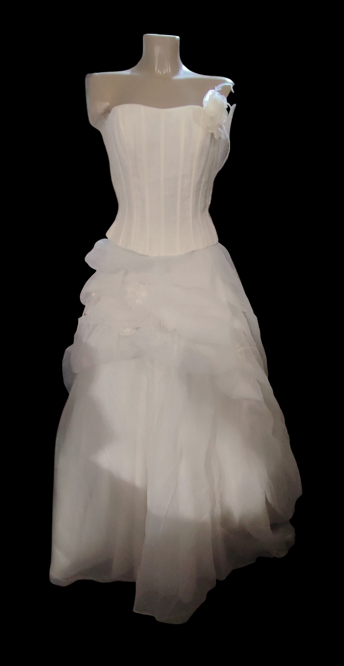 Robe de Mariée blanche avec apport de roses en tissu et plumes. Taille marquée par un bustier décolleté