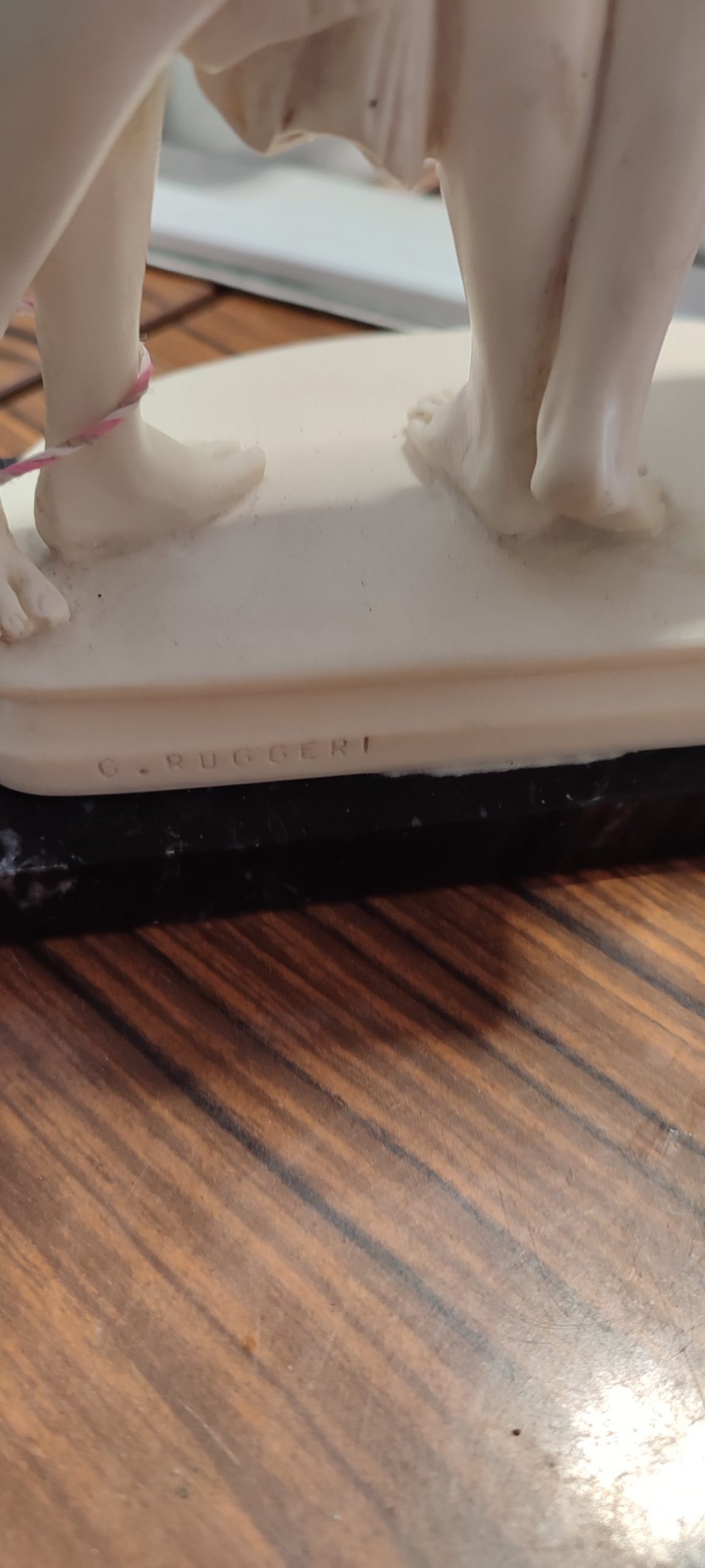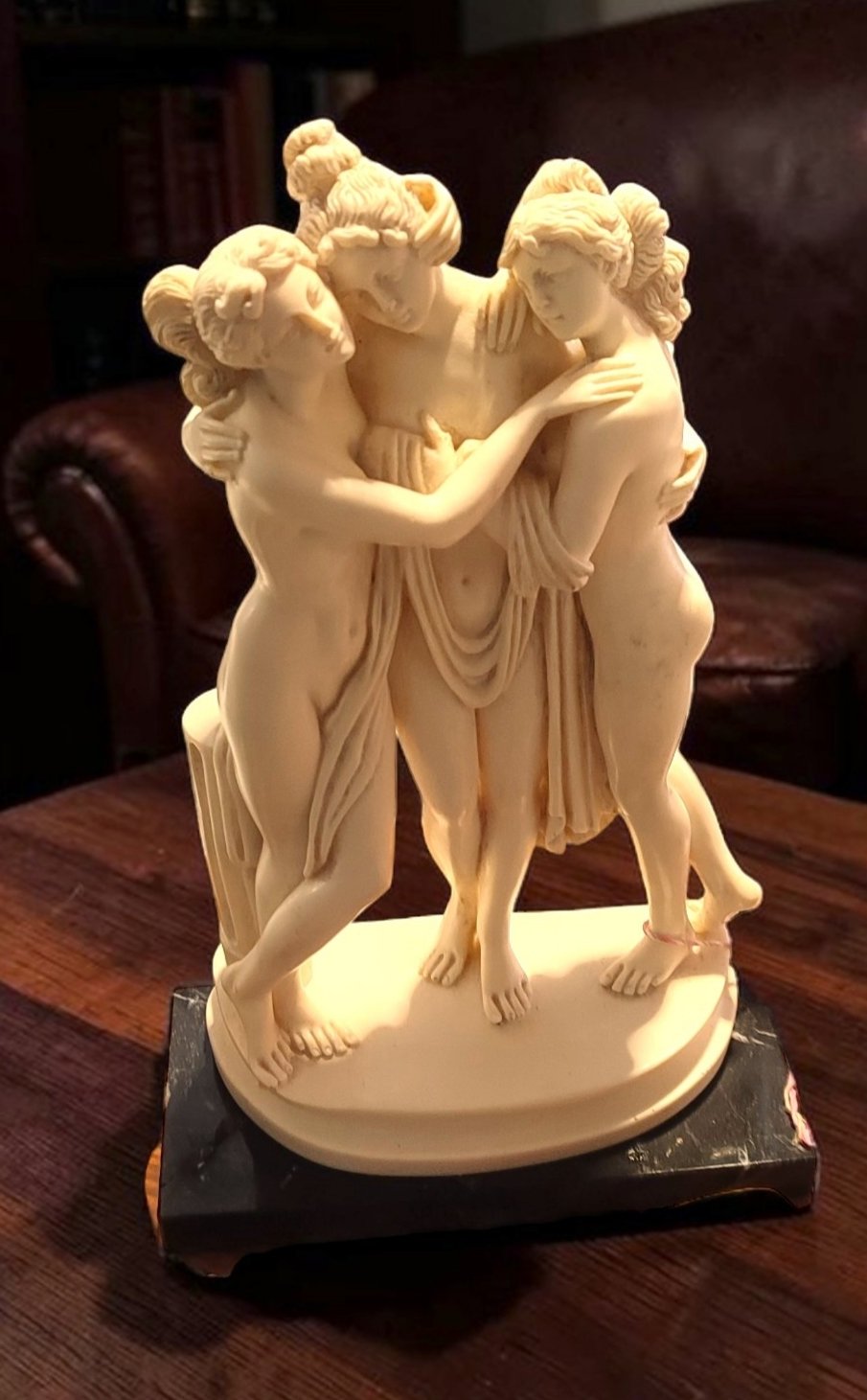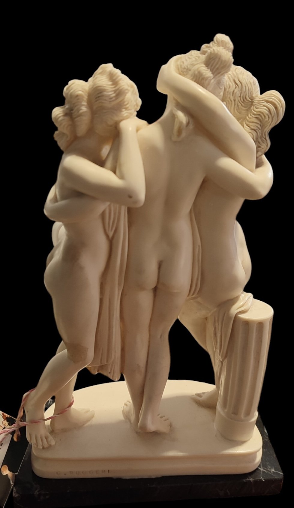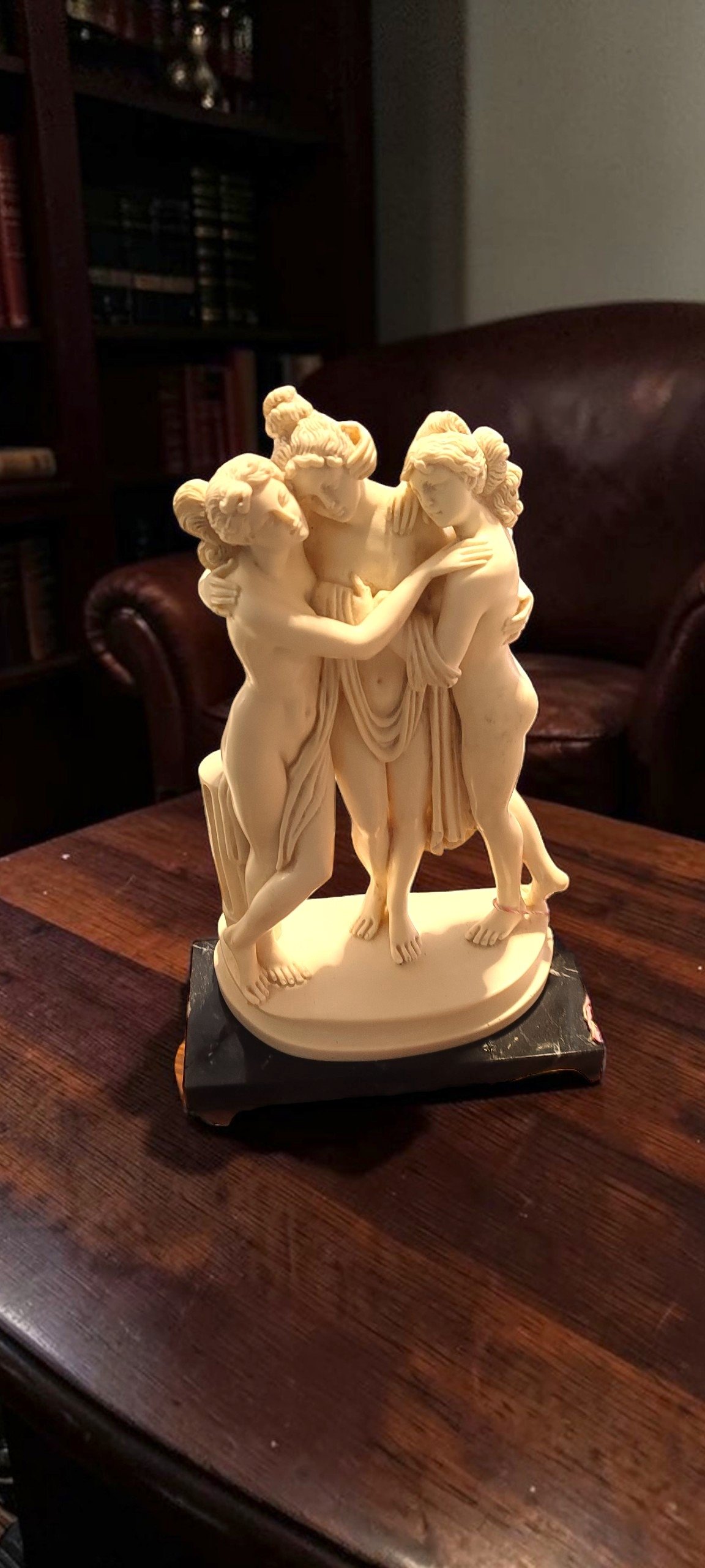 Statuette « Les 3 Grâces » .Petite sculpture en résine de l’artiste italien Gino Ruggeri représente les Trois Grâces de la mythologie grecque dans une interprétation classique. Ruggeri , sculpteur ayant travaillé pour une fonderie toscane, a mis au point un procédé unique de mélange d’albâtre et de résine, conférant à la sculpture une plus grande durabilité et une meilleure résistance à l’eau, tout en préservant son esthétique classique. Cette charmante sculpture porte la signature « G. Ruggeri » à sa base. .