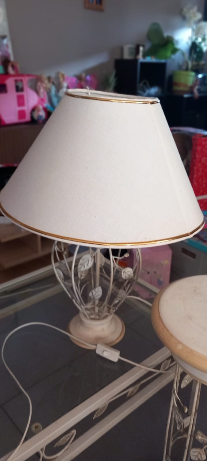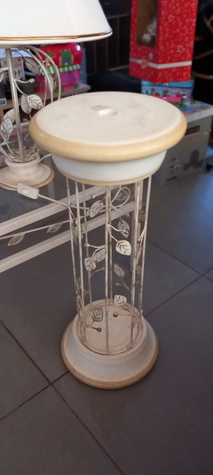 table basse en fer forgé blanc + une colonne et lampe assorties.