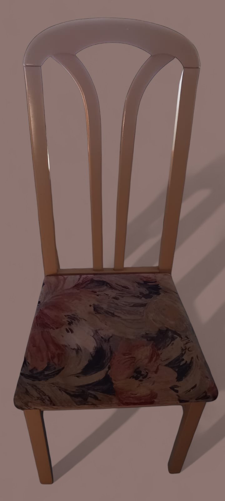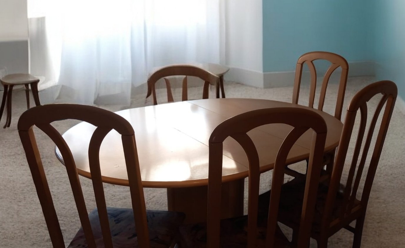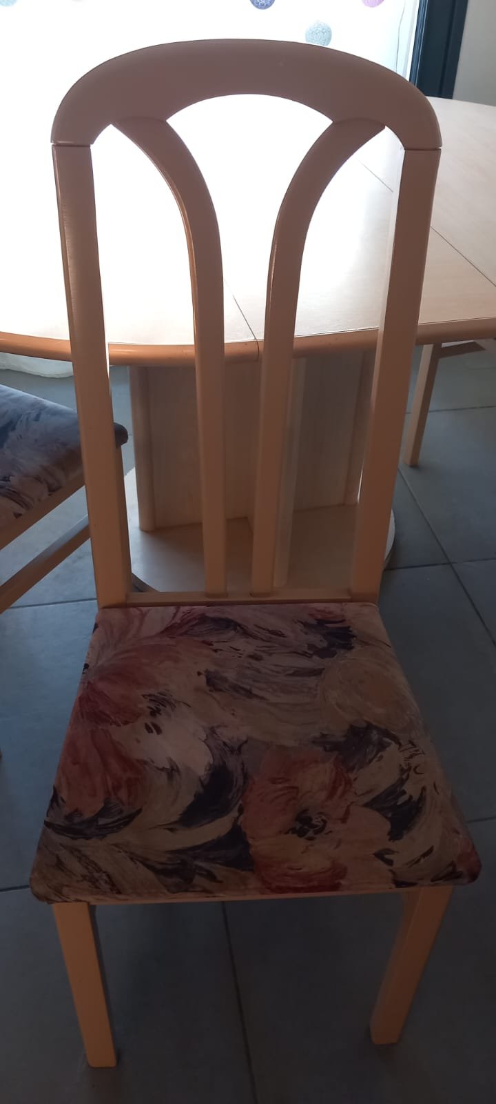 Table ronde en bois blond vernis avec rallonge+ 6 chaises assorties avec assise en tapisserie fleurie.