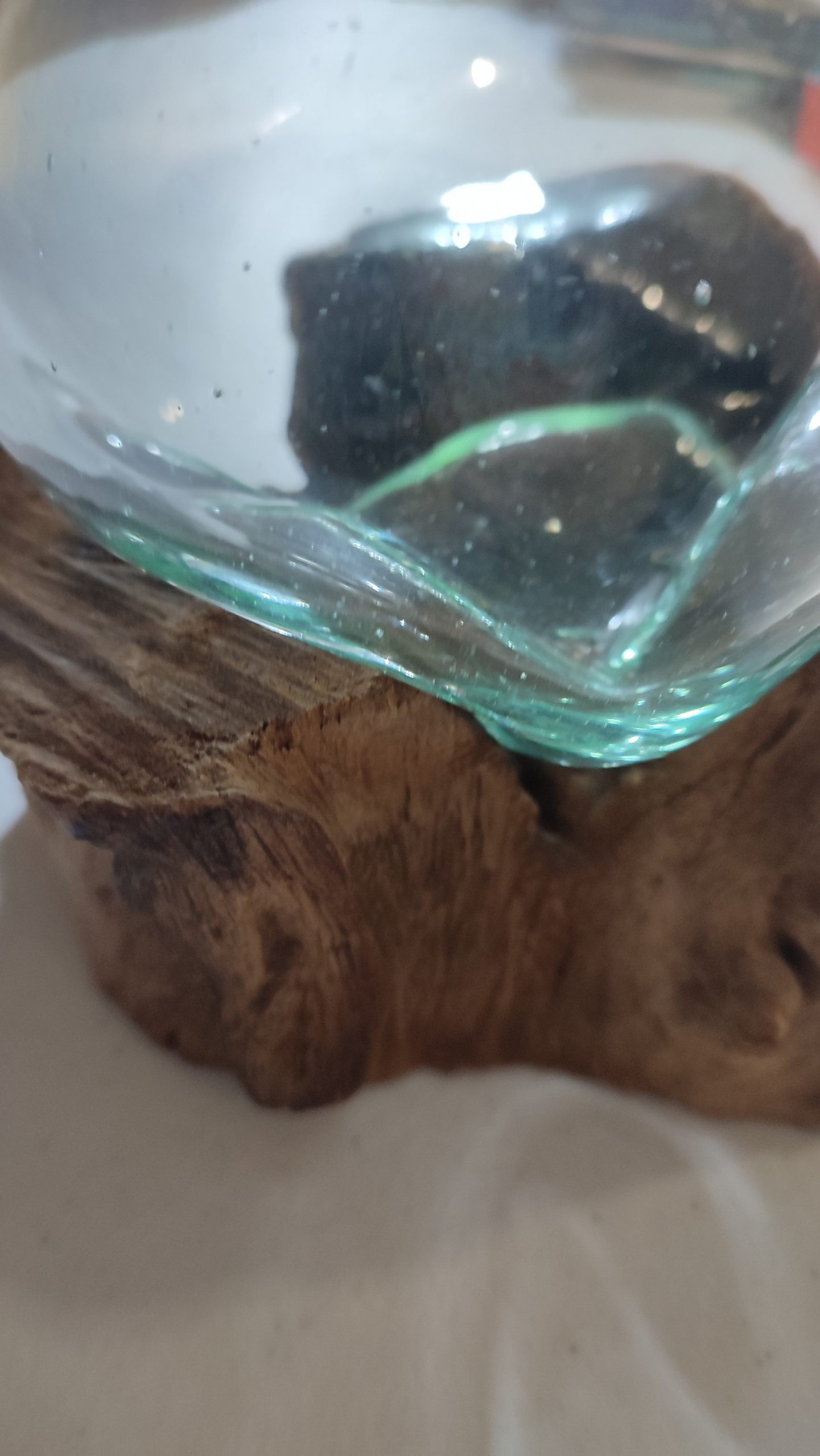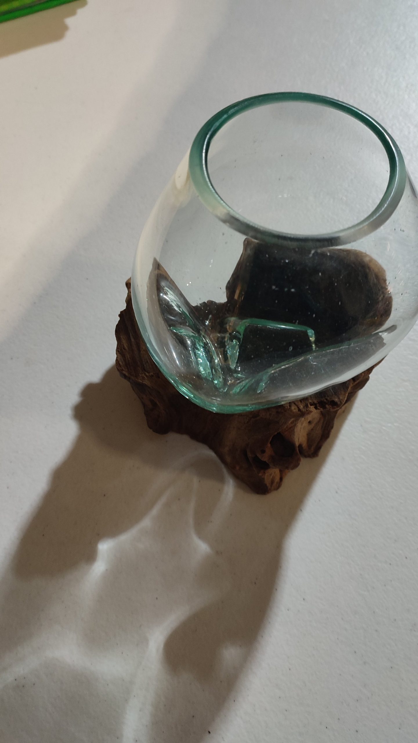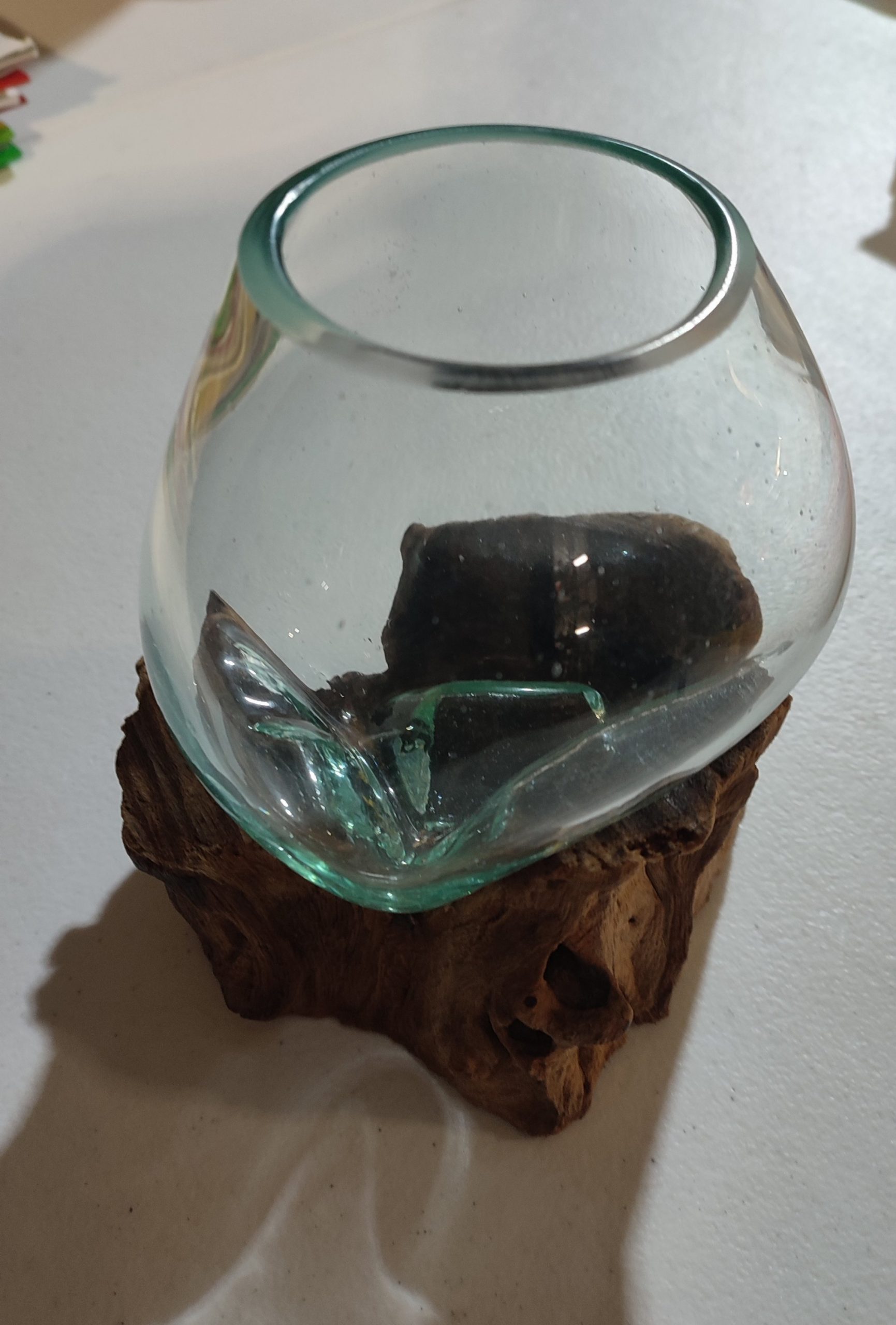Vase rond en verre sur son support en bois flotté